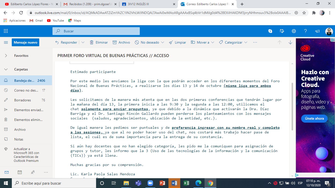 Buen día, por medio del presente mensaje les comunico que los días 13 y 14 de Octubre, asistiré de manera virtual a un Foro por lo que no habrá sesiones de Zoom.